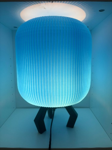 Ar 3D printēts lampas kupols baltā krāsā un melns statīvs. Komplektā ietilpst vads ar slēdzi un spuldze.