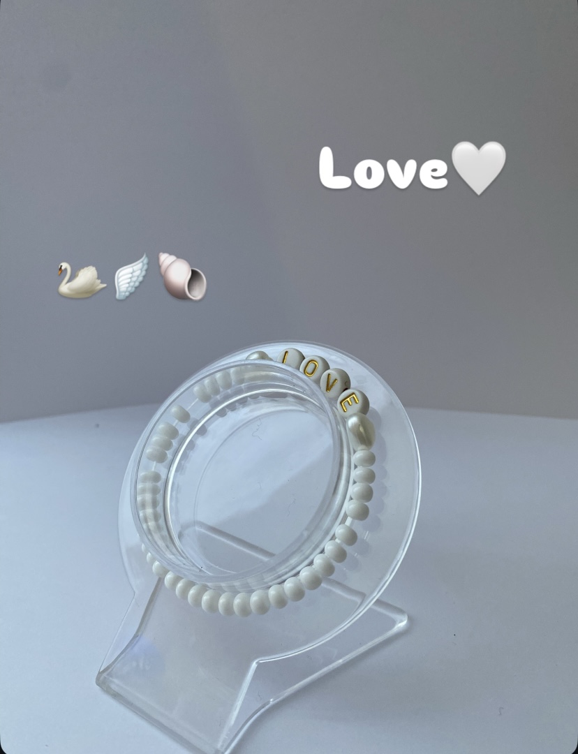 Izgatavota no baltam pērlēm un sirsniņām pa vidū atrodas vārds “Love”