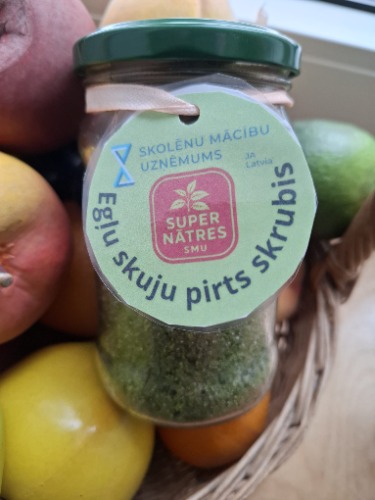 Egļu skuju pirts skrubis. Sastāvā blenderētas egļu skujas, rumjā sāls, olīveļļa.