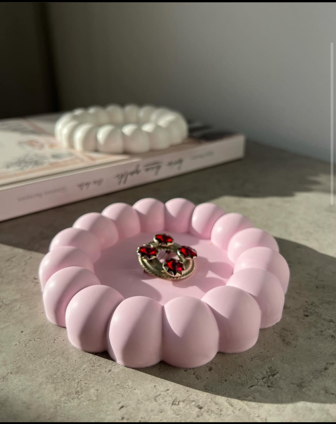 Rozā akrila trauks, kas piemērots rotu, sveču vai dekoru uzglabāšanai un izkārtošanai.